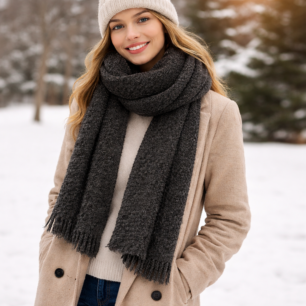 Envolva-se em um calor refinado com o Cachecol Luxe em Alpaca Carvão, um item essencial para o inverno, projetado para elegância, conforto e versatilidade.