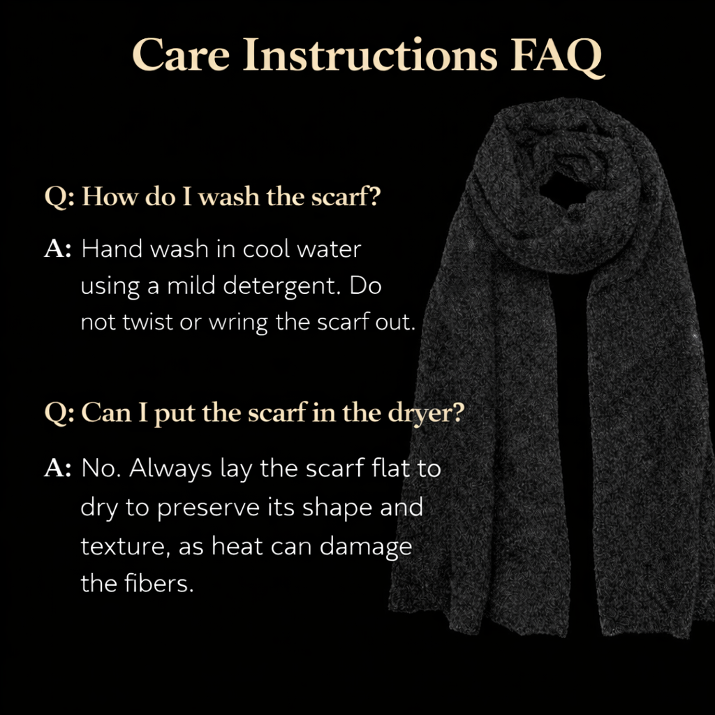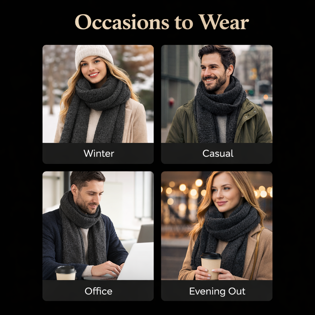 O tom carvão profundo oferece uma estética marcante e atemporal, facilitando a combinação com looks de inverno neutros ou monocromáticos. Seu tamanho generoso permite diversas opções de estilo — enrolado, drapeado ou em camadas — adaptando-se facilmente de looks casuais a produções mais sofisticadas.