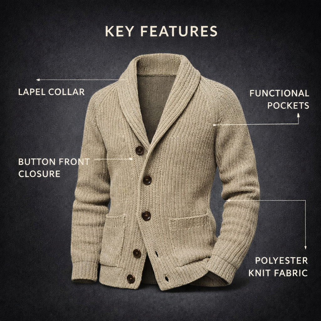 Crafted from a soft and durable polyester knit fabric, this cardigan delivers warmth without excessive bulk, making it ideal for everyday wear and transitional seasons. The lapel collar, button-front closure, and functional pockets create a polished yet relaxed look, suitable for casual, smart-casual, and layered outfits.